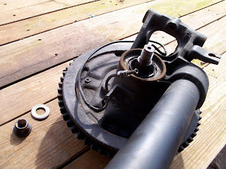 This stub axle, however, pushed out VERY easily. It was almost like the bearing wasn't set in the casing. The axle looked to be in the same good condition as the first, however. If I do reuse these they'll get new inner and outer bearings anyways.