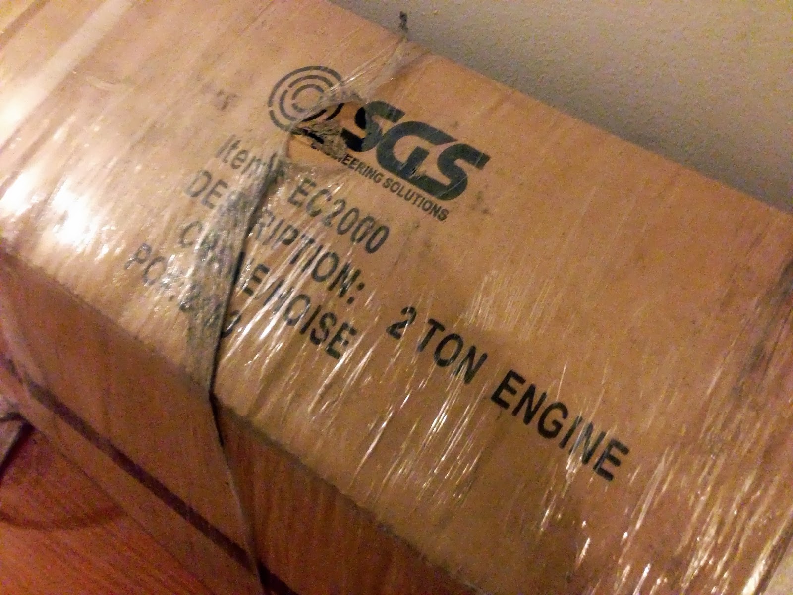 Into the hallway, I began disassembling the box the rest of the engine hoist, from a box with thick plywood ends and strong lateral and transverse straps, which still didn't prevent things inside from shifting a bit.